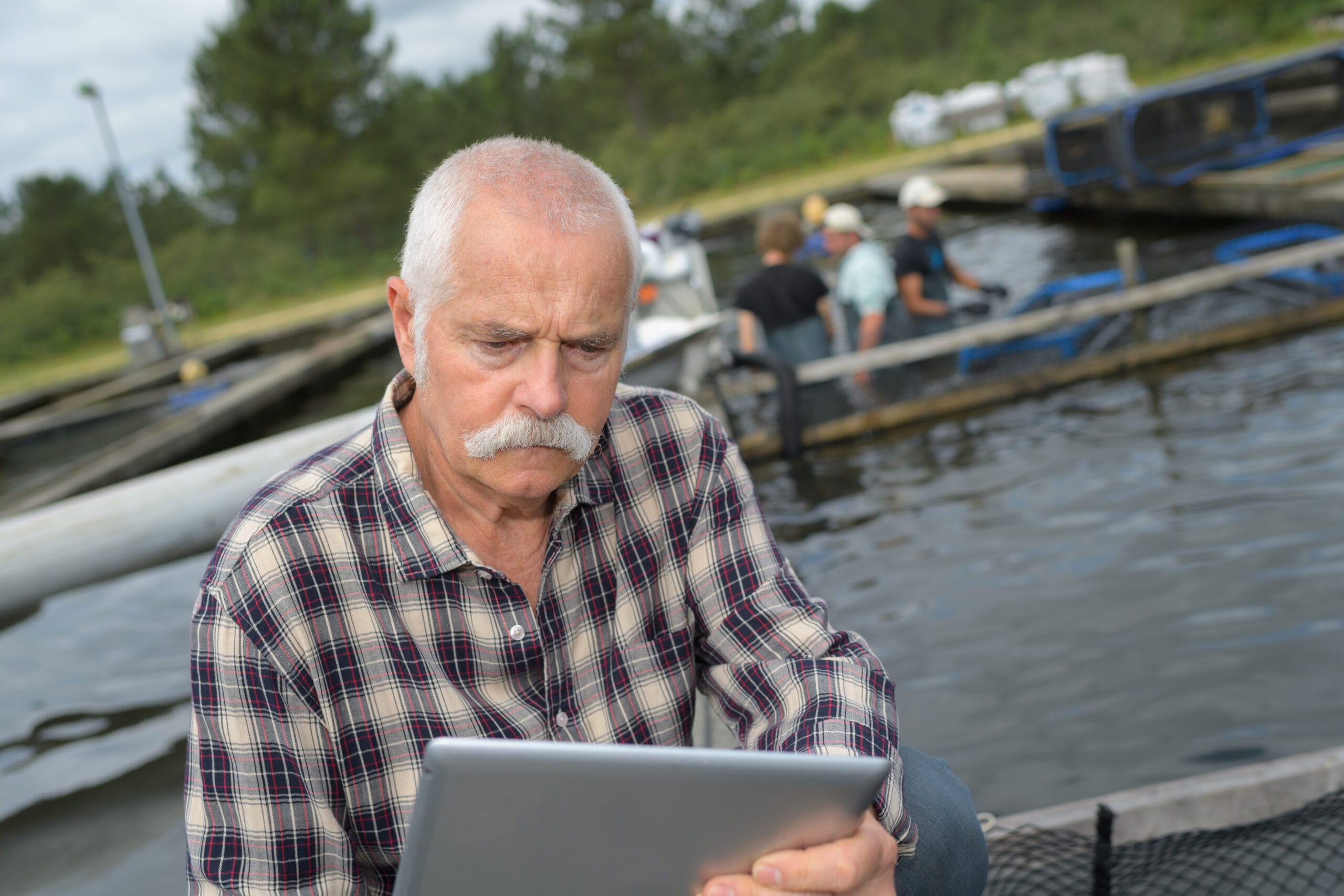 senior worker using tablet in water treatment plant